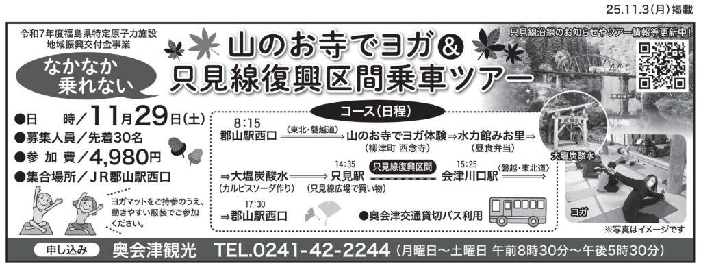 2025年11月7日 / 最終更新日時 : 2025年11月7日 okuaizukanko ☆「山のお寺でヨガ&只見線復興区間乗車ツアー」のお知らせ☆ ◯11月29日(土)に先着30名様限定の只見線ツアーを募集しています。 柳津町のお寺でのヨガ体験や湧き出る天然炭酸水でサイダー作りなど、めったに体験できない特典も! お申込みは奥会津観光までお急ぎください!