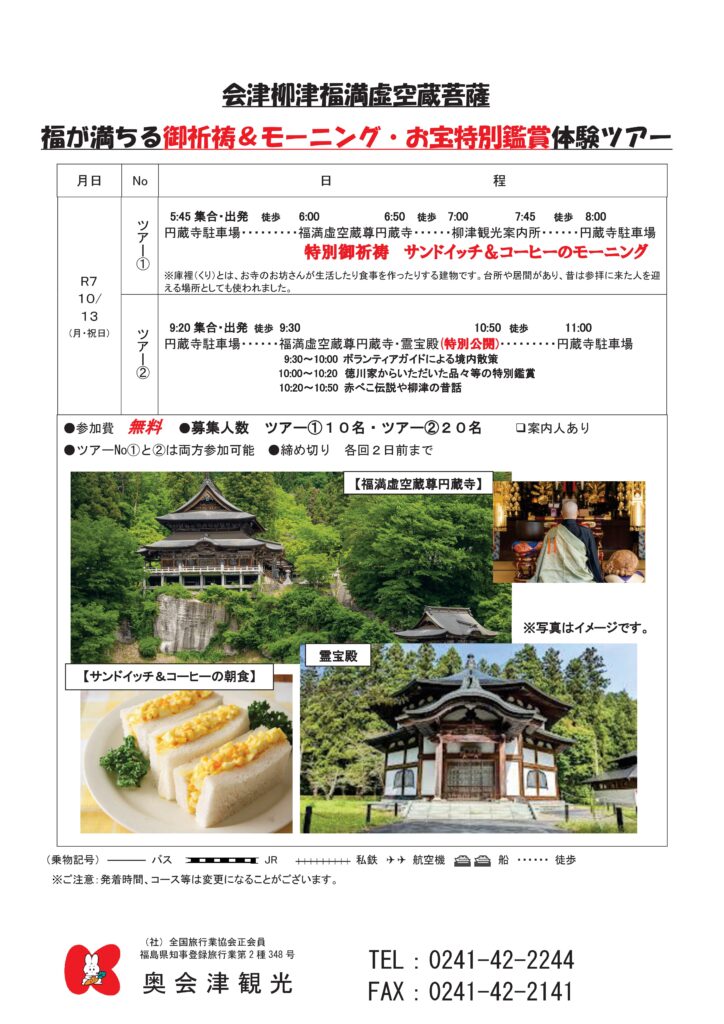 2025年9月27日 / 最終更新日時 : 2025年9月27日 okuaizukanko 「福が満ちる御祈祷&モーニング・お宝特別鑑賞体験ツアー」のお知らせ 柳津圓藏寺は毎月13日に早朝ご祈禱や宝物殿の公開 など特別企画を実施しています。 それに合わせて10月13日(月)は圓藏寺モーニングツアー を実施いたします。参加費は無料です。 人数に限りがありますのでお早めにお申し込み下さい。